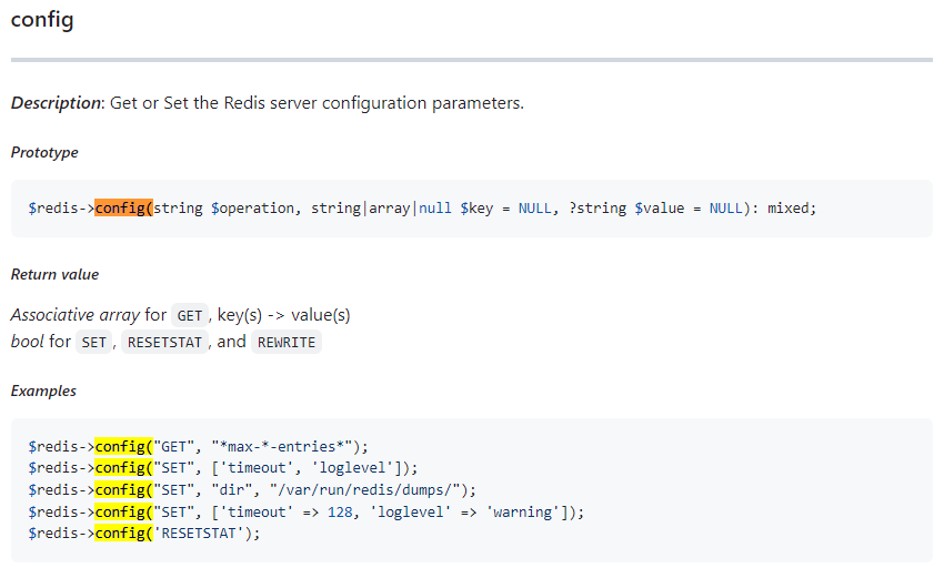 - 'Get or Set the Redis server configuration parameters' , 즉 서버 설정값들을 가져오거나 세팅하기 위한 함수.