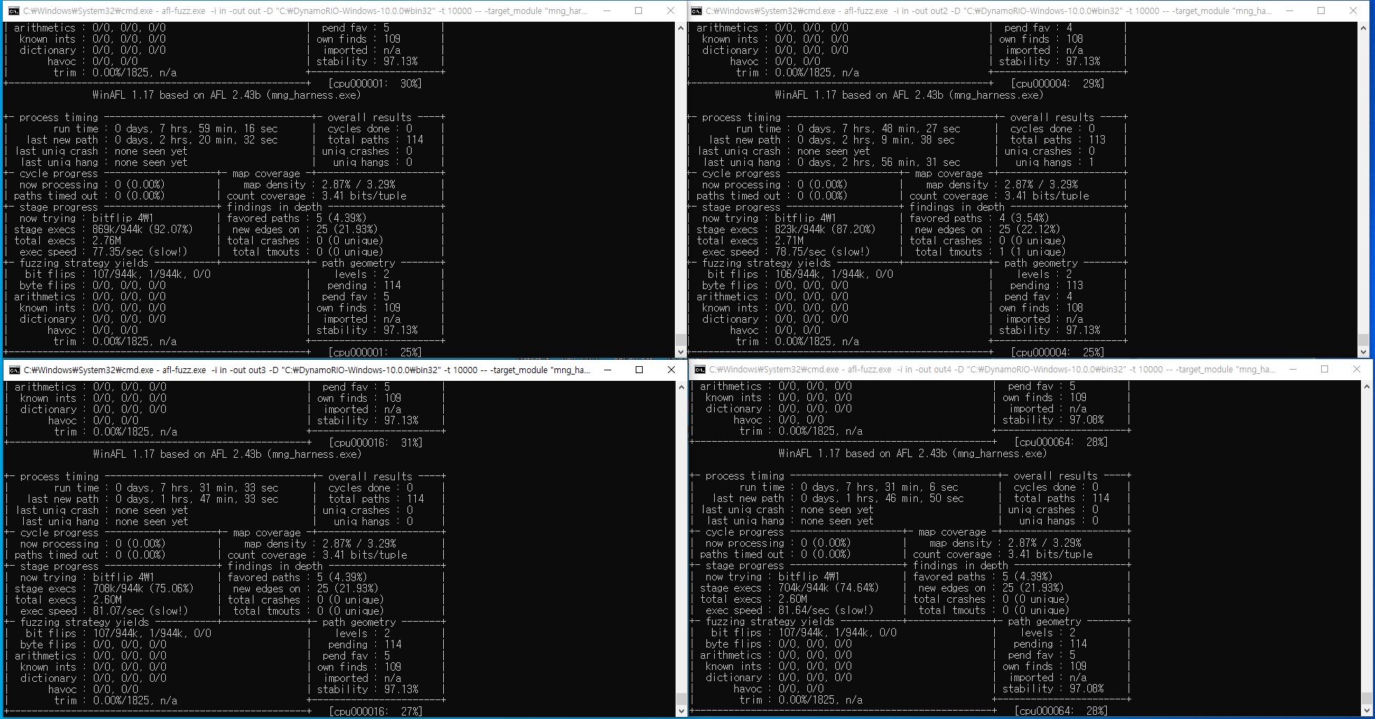 C:\DynamoRIO-Windows-10.0.0\bin32\drrun.exe -c winafl.dll -debug -fuzz_iterations 10 -coverage_module “Mng.dll” -target_module “mng_harness.exe” -target_method fuzzme -- mng_harness.exe “C:\www\testcases\mng\input.mng”