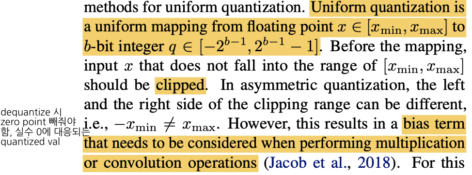 거창한 건 아니고 실수 0에 대응되는 quantized value도 0이면 symmetric, 아니면 asymmetric이다. asymmetric이면 zero point를 빼서 (bias) dequantize 필요