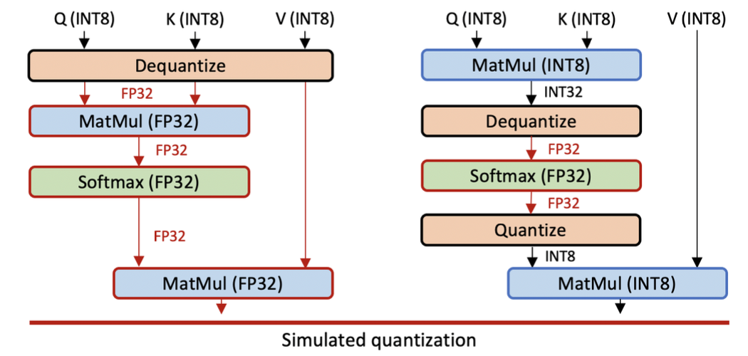 - 연산 중간에 dequantize 하여 fp32로 실제 연산을 수행하는 simulated quantization, 혹은 integer-only quantization
