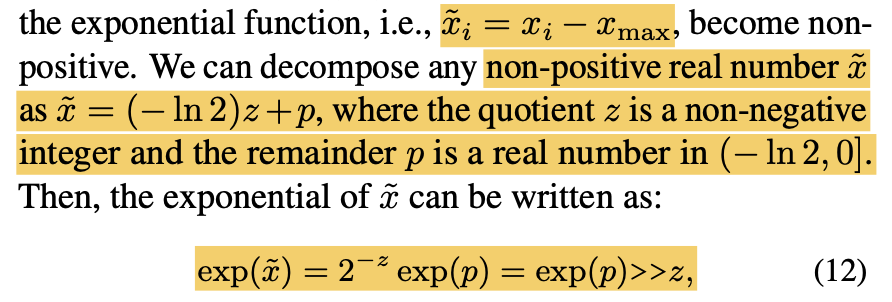 x_i - x_max 는 -ln2로 나눈 몫 z와 나머지 p로 표현 가능하고, exp(x_hat) 은 단순한 integer operation으로 바뀐다