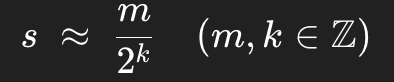 cf) dyaic number란 "정수 / 2의 거듭제곱 꼴의 숫자" 를 말함, fp 연산을 정수 산술 + bit shift로 대체하기 위해 고안된 기법