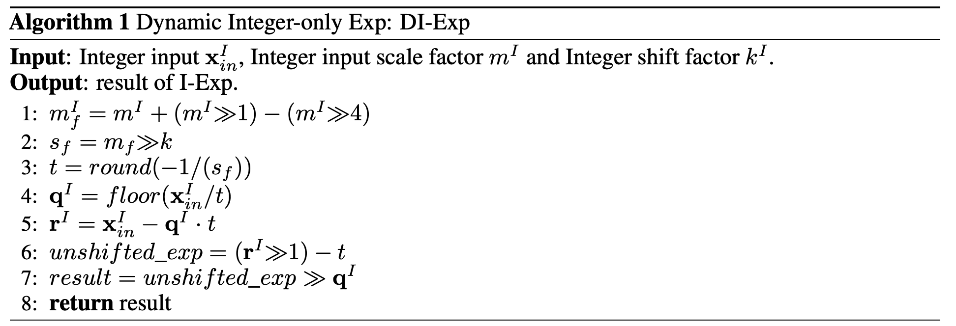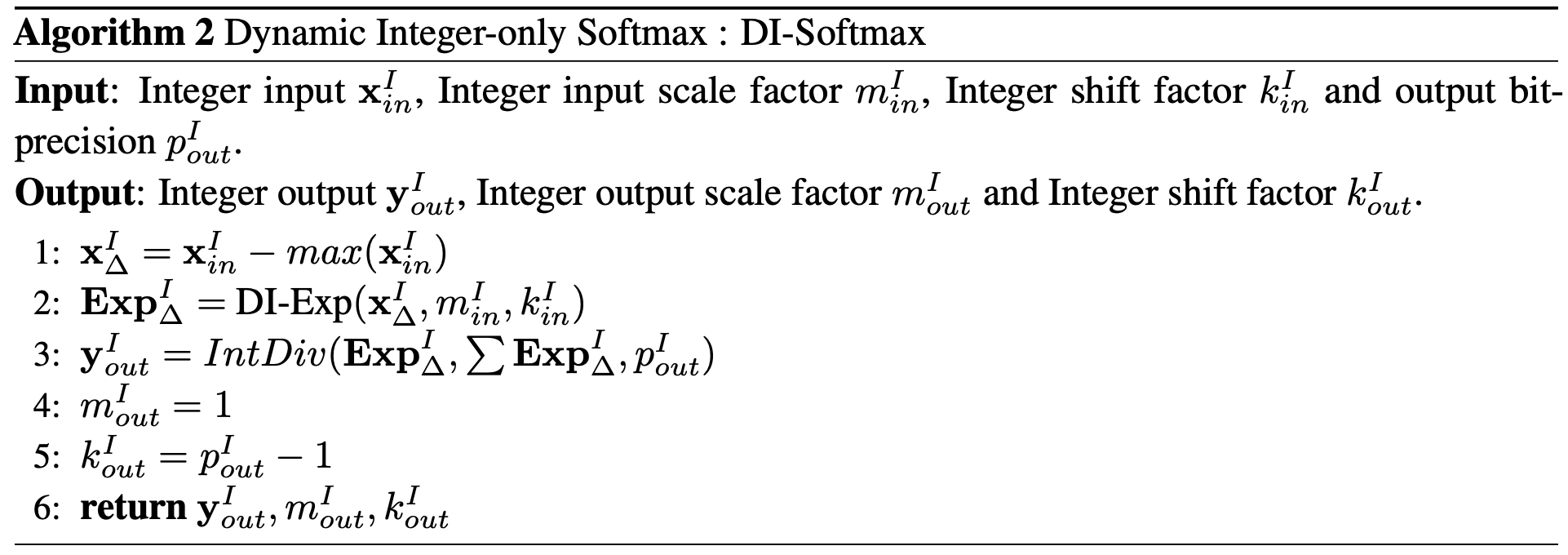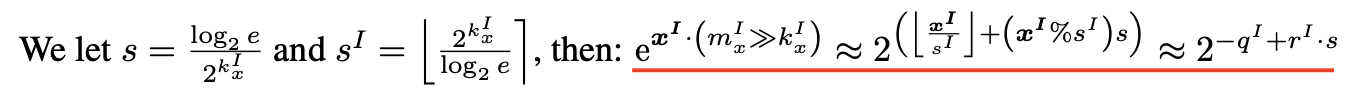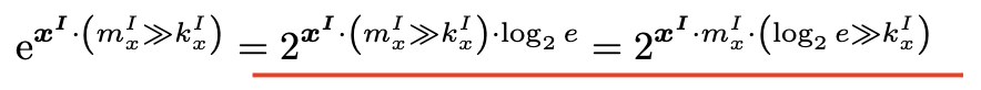 x를 x_I 와 scale (dyaic number m_x, k_x 로 표현), shift 연산을 위해서 밑을 2로 바꾸고 log_2(e) 도입