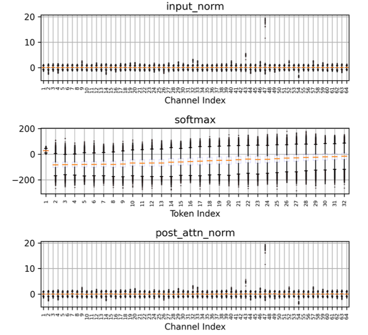 * per-channel, per-token 으로 보면 값이 많이 튄다, 특히 non-linear 직후의 activation이 그렇더라, smoothing 없이 무작정 quantize하는 건 정확도에 치명적인 영향을 미친다
