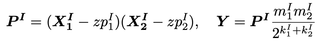 - X1, X2 를 zp에 대해 보정하고, 실제값/S 에 대응되는 정수로 만듦 => 그리고 scale s1, s2를 곱하면 최종 fp result Y의 근사값 나옴!!