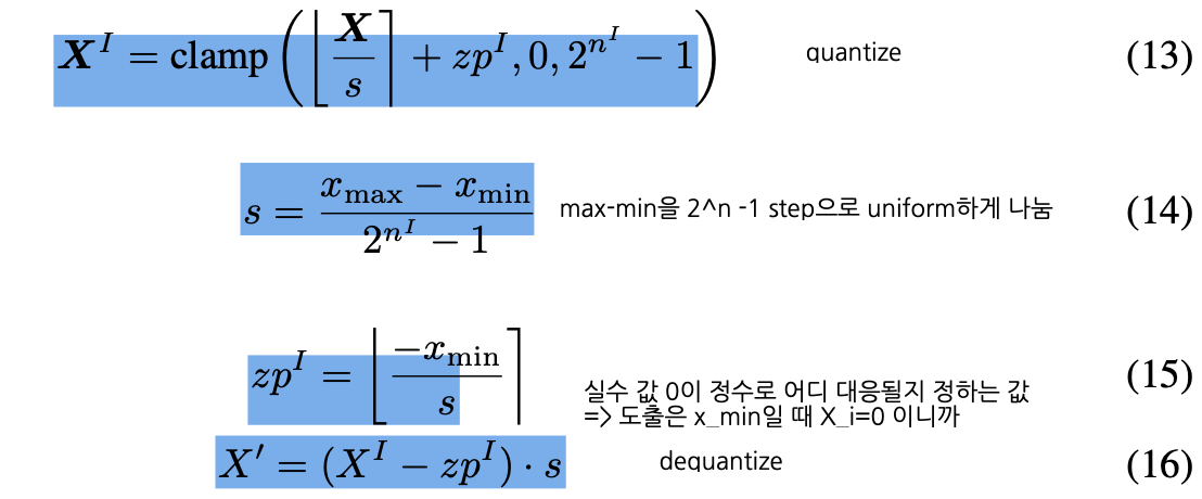 - (14) 처럼 scale factor를 구하고, (13) 처럼 quantize를 한다 (n = bits to use for quantization)