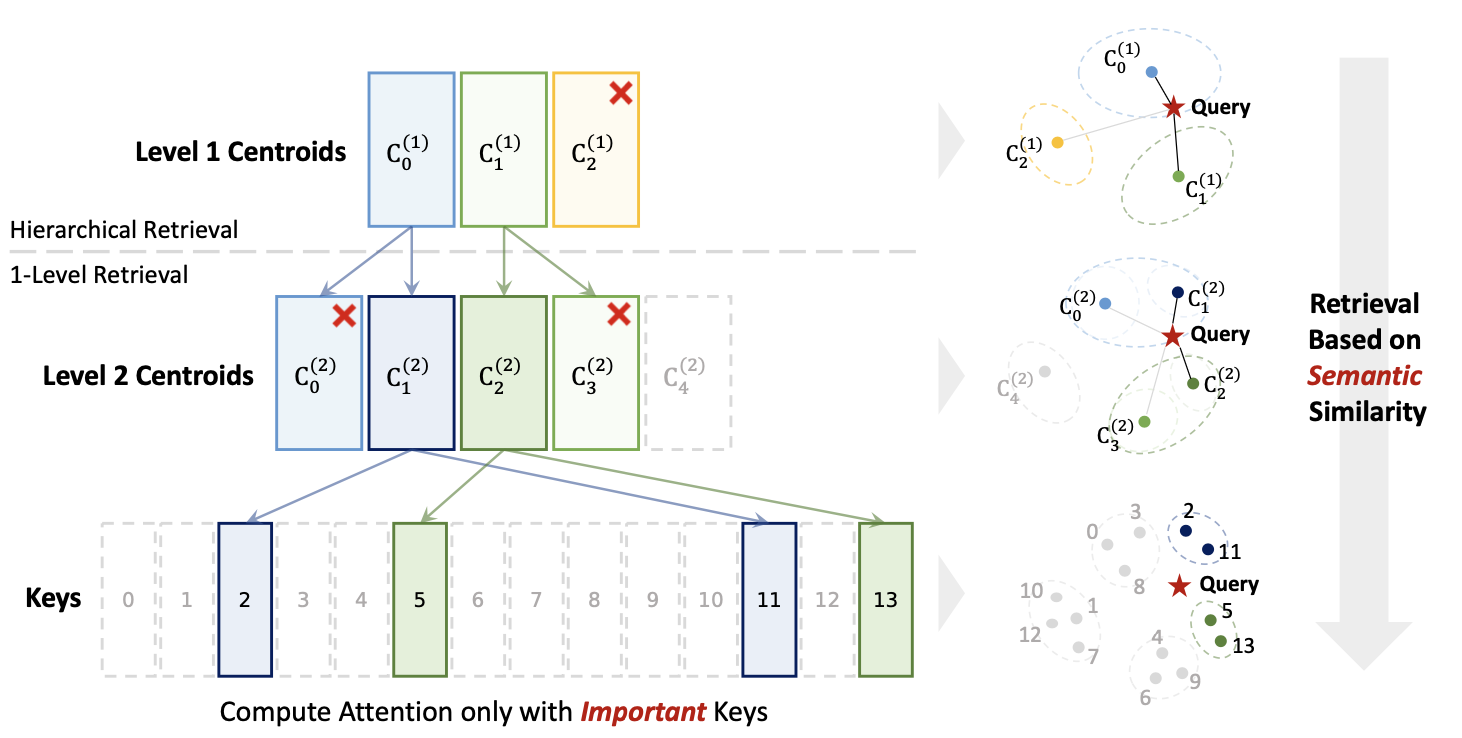 - online에서는 query token과 centroid를 비교하여, 진짜 중요한 일부 key들만 retrieve하여 exact attention을 수행한다